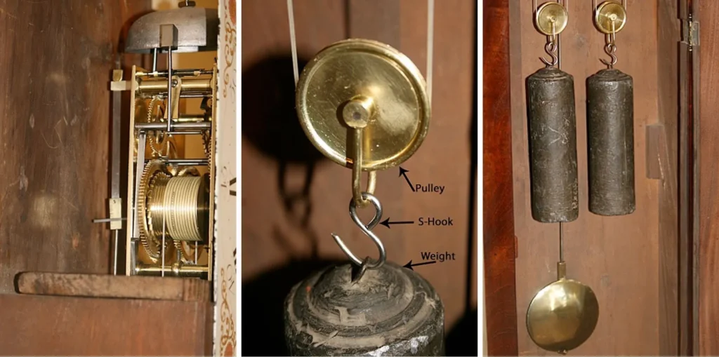 Most 8 day longcase clocks need to be wound once a week. If you have a weight-driven clock, check the cable or line is not tangled and is properly seated in the groove in the pulley. Generally, the heaviest weight goes on the right side, the next heaviest weight on the left, and the lightest one in the centre. Many clocks use similar weights on the left or left and centre. Always put the heaviest weight on the right.