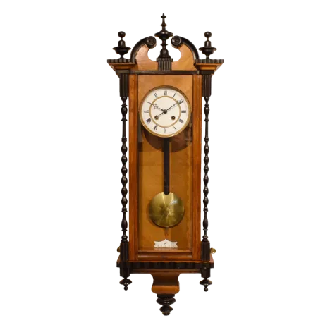 This is done by the nut on the bottom of the pendulum. Often at the pendulum bob is a collar with a V notch in it, make sure the bob is always sitting correctly in the notch. If there are two nuts under this, then one is used to tighten the bottom nut against it. Turn the nut to the right (clockwise) to go faster and to the left (anti clockwise) to go slower. The shorter a pendulum is the faster the clock goes. To slow a clock down, make the pendulum longer by adjusting the ‘rating’ nut below the pendulum. Just one revolution in the required direction per day and always reset the hands to time. Patiance is required to achieve results do not rush the process.